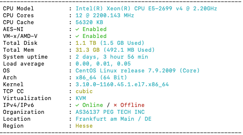 本次评测的法兰克福裸机云大带宽服务器搭载E5-2620处理器、32G内存和1T HDD存储,配备1Gbps大陆优化带宽,预装CentOS 7.9系统。这款位于法兰克福的裸机云产品以其卓越的网络性能和稳定的硬件配置,专为跨国业务、高负载运算及海量数据传输场景打造,重新定义了裸金属服务器的性能边界!