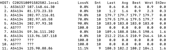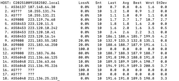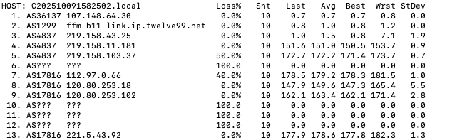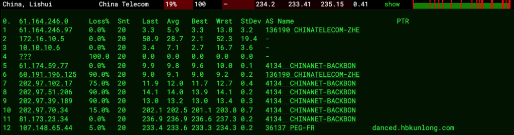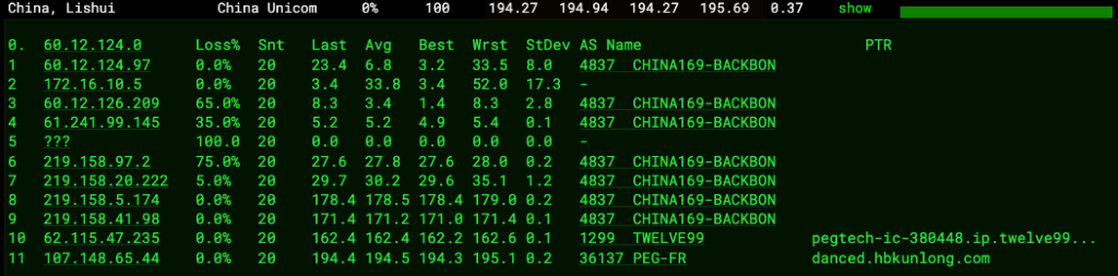 3.3.1 ping.pe国内联通节点去程MTR,如下图: