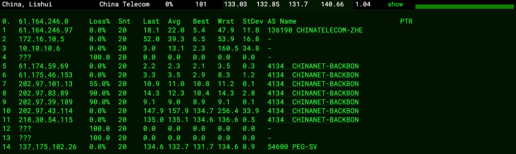 3.3.1 ping.pe国内联通节点去程MTR,如下图: