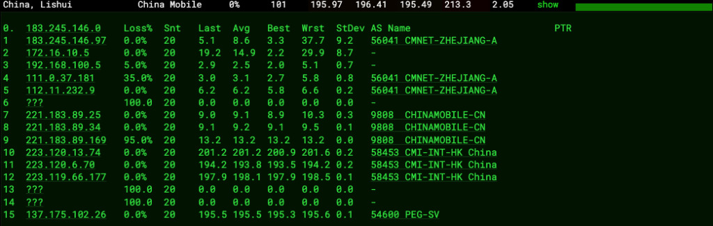 3.4.1 ping.pe国内移动节点去程MTR,如下图: