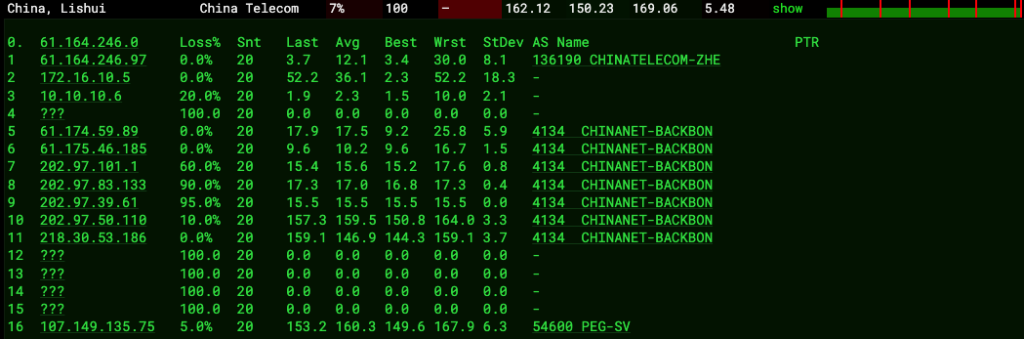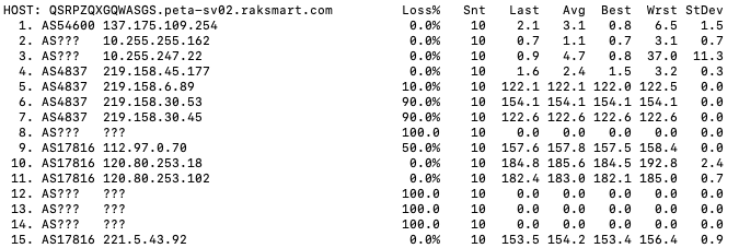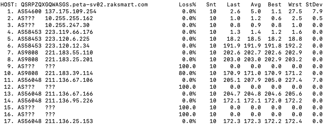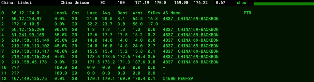 3.3.1 ping.pe国内联通节点去程MTR,如下图: