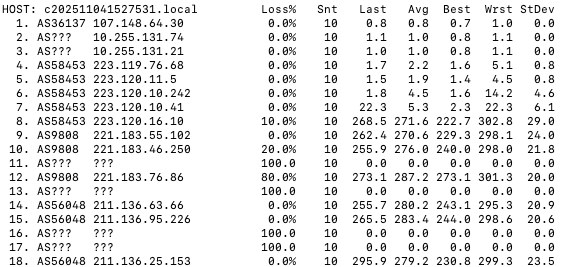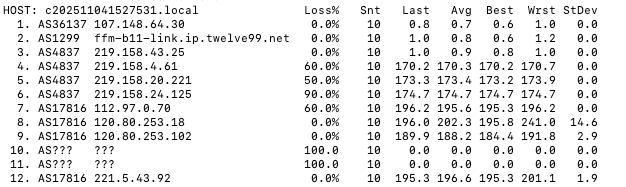 本次评测的重点——大陆优化G口带宽,其价值在于针对中国方向的网络路由做了特殊优化。通过MTR路由追踪分析,去程路由主要走各自运营商的骨干网直连,回程强制走CN2优化线路,有效减少了网络绕行。