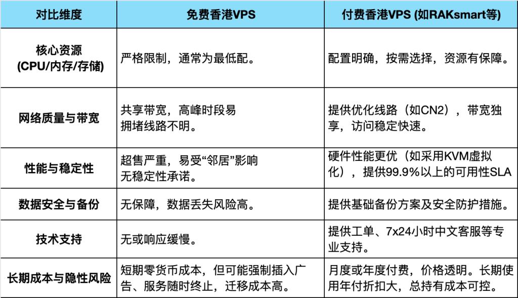 免费香港 VPS 看似省钱,实则暗藏隐性成本:高峰时段无法访问、数据丢失无备份、因资源滥用被封号等问题,可能导致业务中断。对新手而言,若需长期稳定使用,付费 VPS 才是最优解。