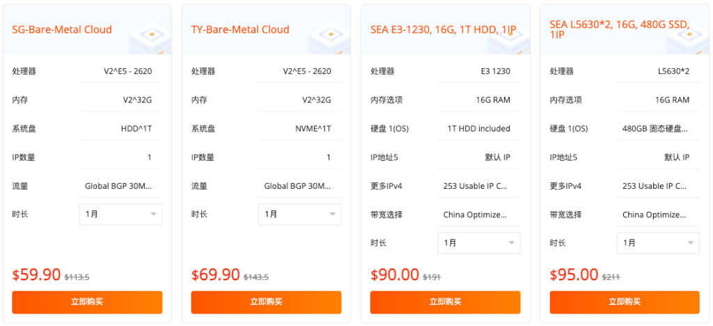 活动专区爆款服务器续费同价,新加坡 / 台北等地 Bare-Metal Cloud 机型,32G 内存 + 1T 硬盘配置,首月仅 $59.9 起,长期用更划算;秒杀倒计时已启动,手慢无!