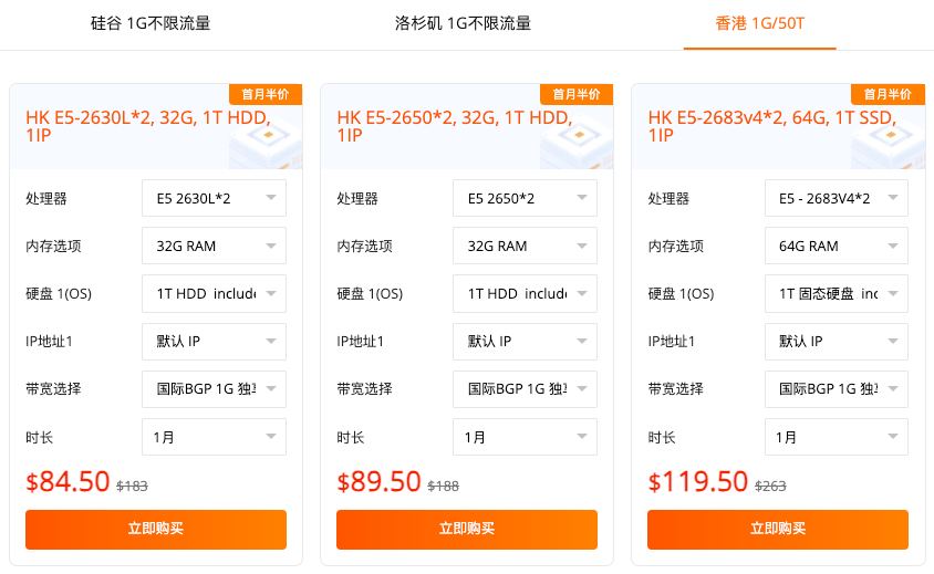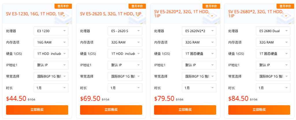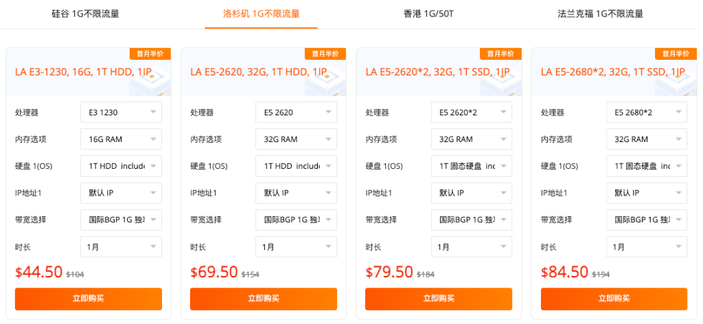 国际 BGP 1G 大带宽:硅谷 / 香港等地机型,E3 处理器 + 16G 内存,首月 $44.5 起,适合跨境业务;