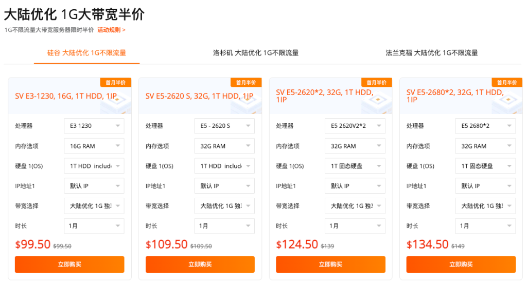 基础款:E3-1230 / 16G / 1T HDD + 1G大陆优化带宽,首月 $99.50。