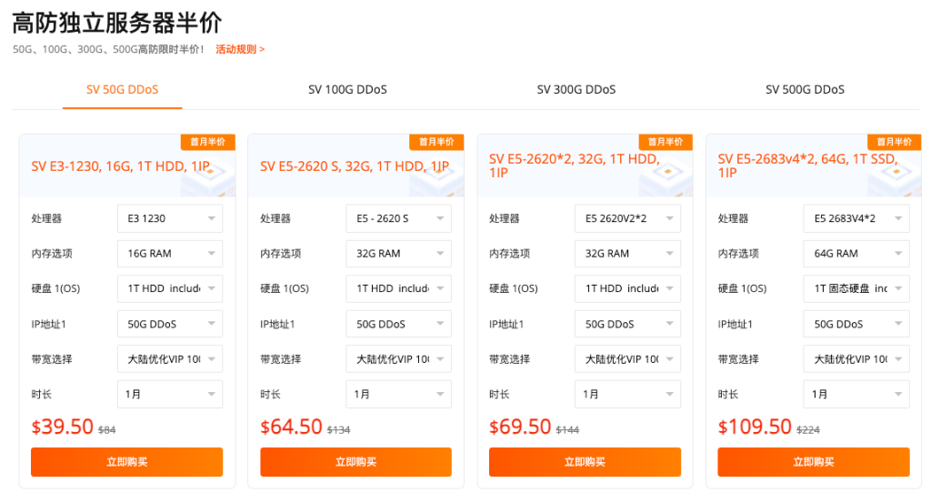 真半价:高防、大带宽核心产品首月价格直接减半。