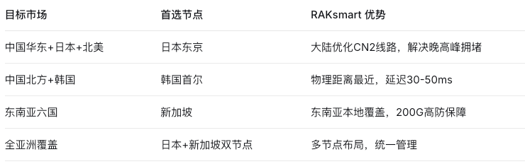 如果你的用户集中在东亚及北美,日本东京机房配合RAKsmart的CN2优化线路,能让你在晚高峰依然保持流畅;如果你的核心市场在中国北方及韩国,首尔节点的物理距离优势将带来30-50ms的超低延迟体验;如果你瞄准的是东南亚六亿人口红利,新加坡机房的区域覆盖和高防能力,则是你出海航程的“压舱石”。