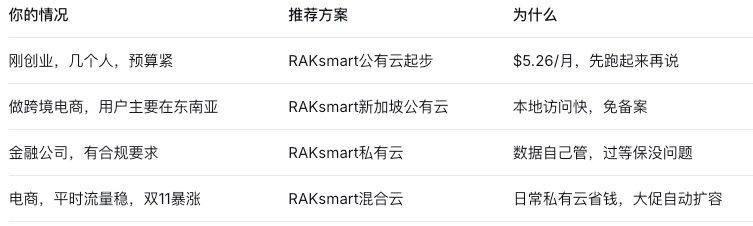 而RAKsmart的价值在于:不管你最后选哪种,它都能给你配齐。从$5.26的入门公有云,到完全定制的私有云,再到灵活弹性的混合云,RAKsmart用全球30+数据中心和多年运维经验,让你不用为“选错”担心——因为你可以随时调整。