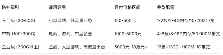 防护能力通常以Gbps为单位衡量,防护阈值越高,价格呈指数级上升。从50G升级到100G,价格可能翻倍 。主流防护等级可分为:
