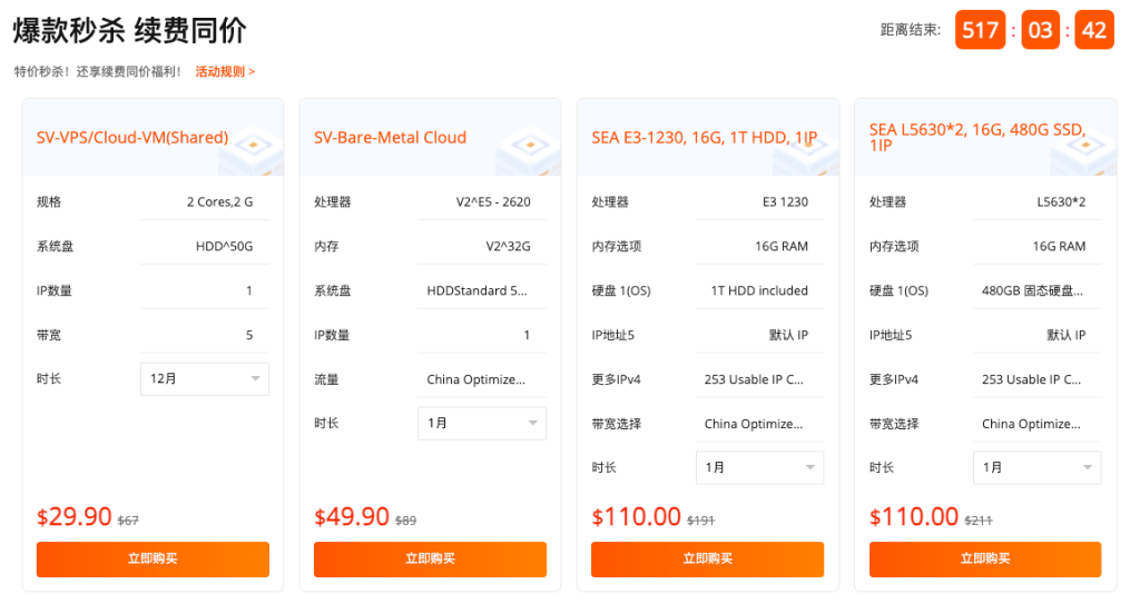 本次活动主打爆款秒杀 + 续费同价,VPS 国际 BGP 大带宽、大陆优化大带宽机型均享半价优惠,低预算也能入手高带宽、低延迟的优质国外 VPS,不管是建站、测试还是日常使用都非常合适。